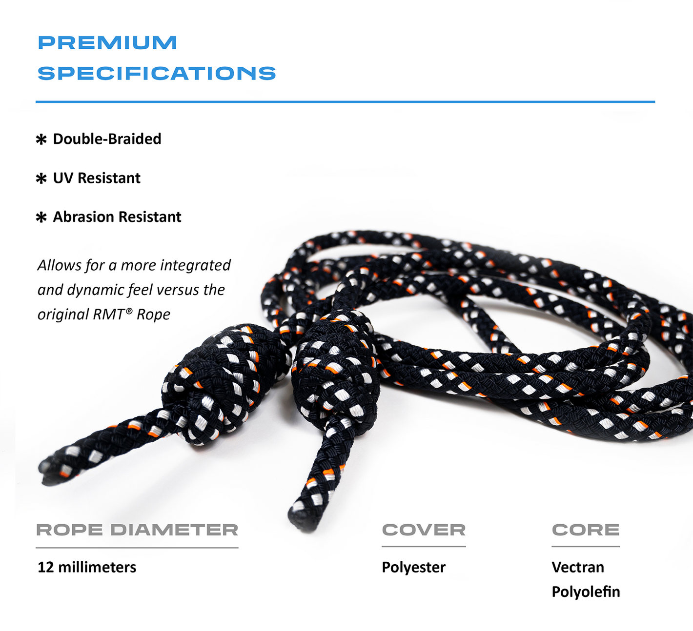 Utilizing hybrid performance technology, the RMT® Premium Rope features a strong core of blended Vectran and polyolefin with a durable polyester cover. This allows for a more integrated and dynamic feel while rolling compared to the RMT® Rope Original.