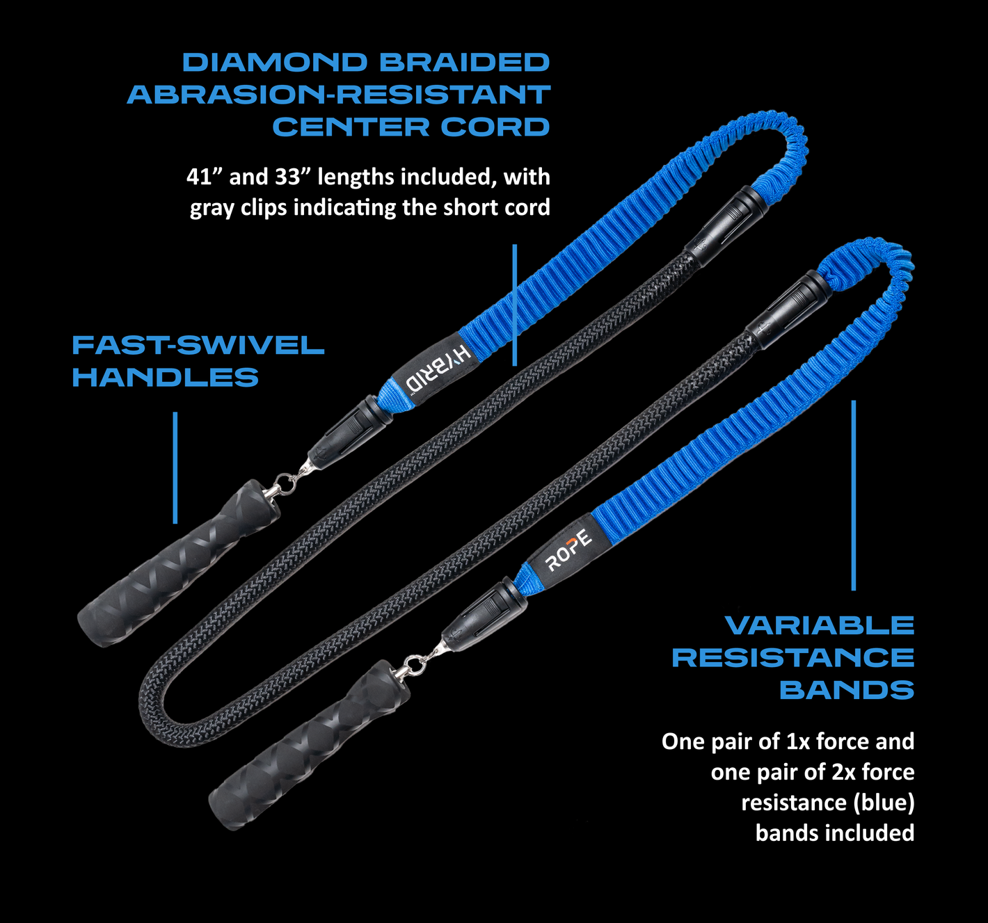 The Hybrid® Rope offers interchangeable elastics allowing you to increase resistance on your non-dominant side to build greater strength and coordination.